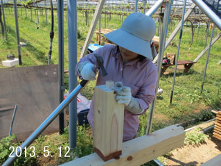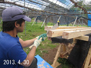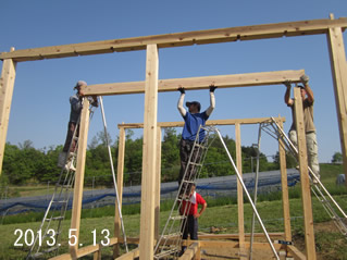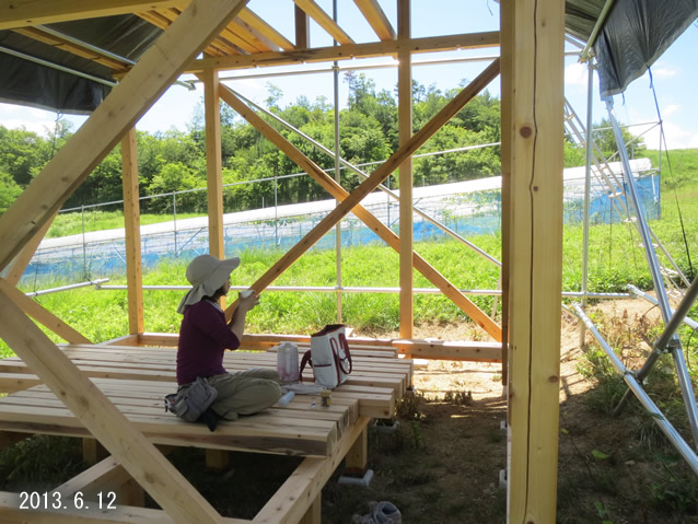 | 無事棟上完了!本当に出来るのか不安でしたが、ここまで出来てホっとしました。 ブドウの作業も忙しくなり、2013年の小屋作りはここで一旦終了となりました。 |