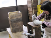 | 西洋ミツバチは業者から蜂を購入しますが 日本ミツバチの場合、野生の蜂を捕獲するところから始まります。 捕獲するため、まず巣箱を作ります。 |